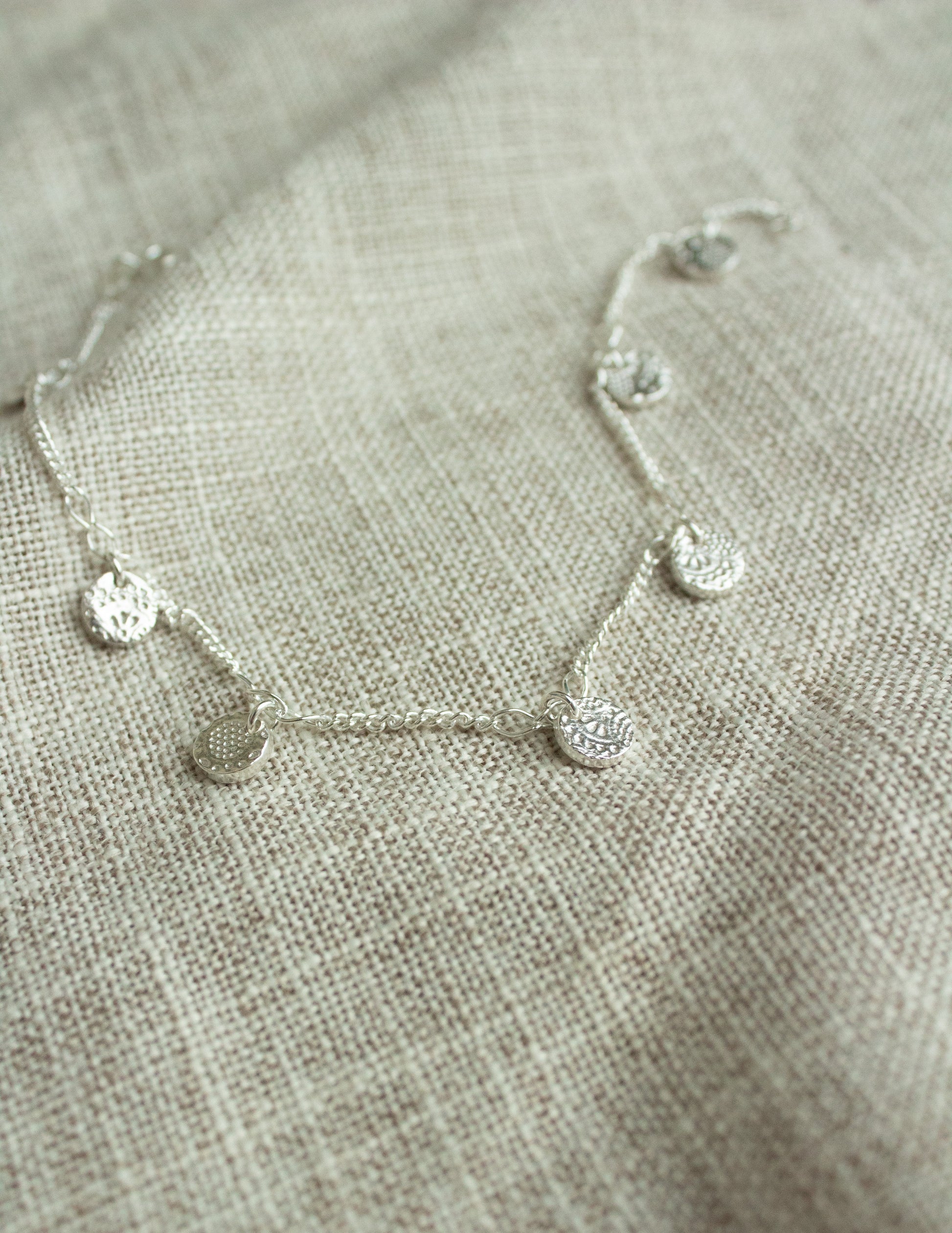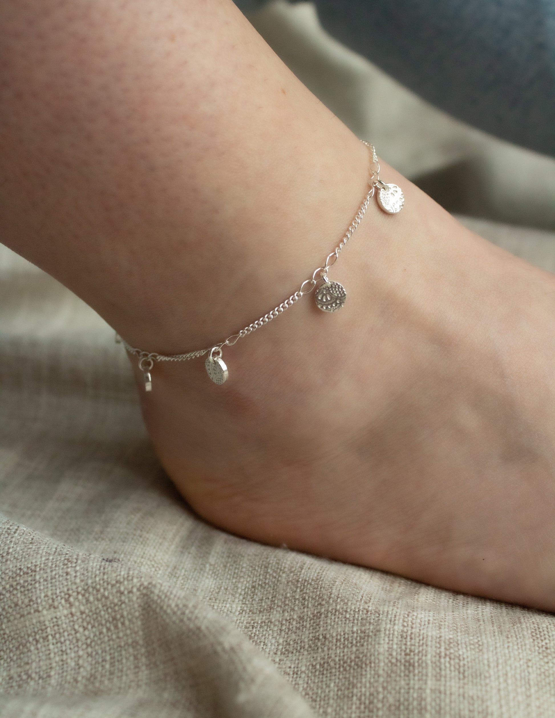 This anklet come on a 9” sterling silver superior alternate cable/trace chain with 7 mini bohemian patterned discs evenly placed around the chain, So it sits effortlessly on the ankle.