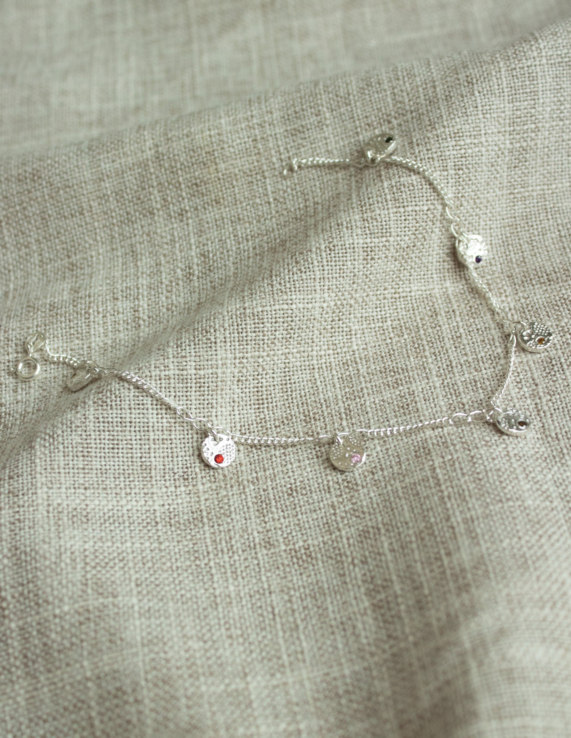 Looking for a stunning disc bracelet but for your ankle? well look no further our small disc bohemian anklet is the piece we all need to add to our jewellery collection this summer! It has a beautiful bohemian pattern that has been handcrafted into each disc making it different to your ordinary disc jewellery. You can choose to have it in plain sterling silver with just the pattern on the disc or add some colour to your ankle and choose the multicolour Cubic Zirconia gemstones anklet.