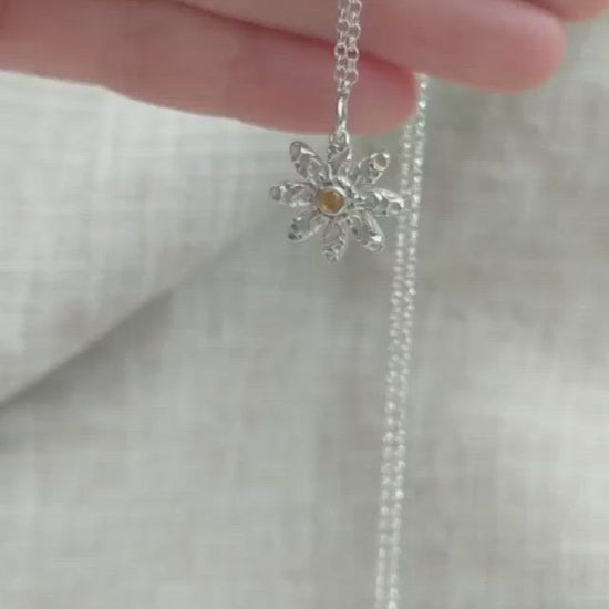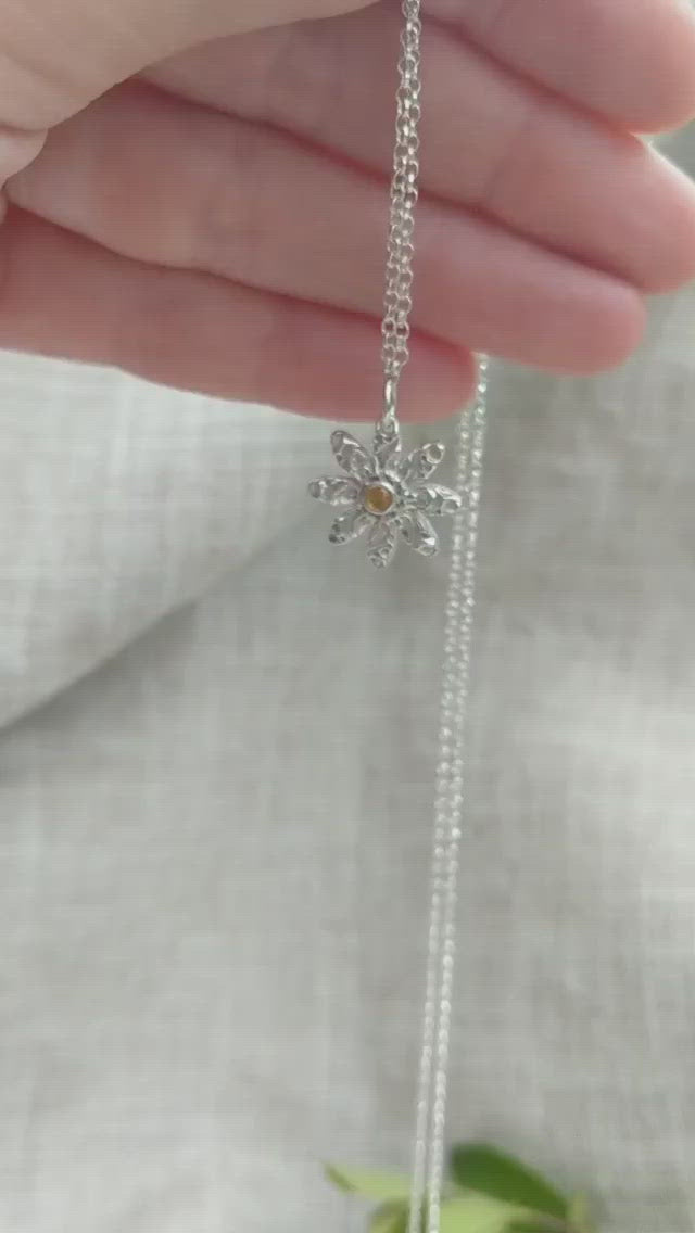 Carry the sunshine with you everywhere, with this gorgeous Citrine Daisy pendant. With its stunning detail and beaming yellow/orange cabochon gemstone in the centre. As Citrine is the birthstone of November this necklace would make a lovely gift for someone celebrating a birthday in November.