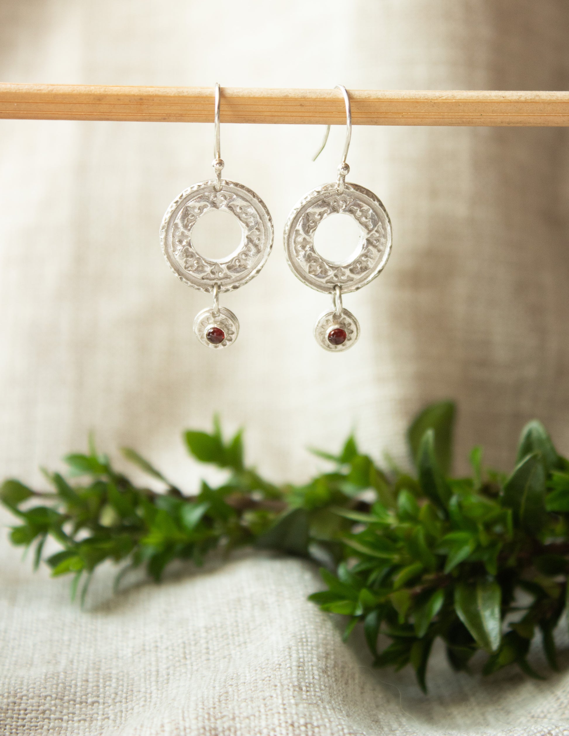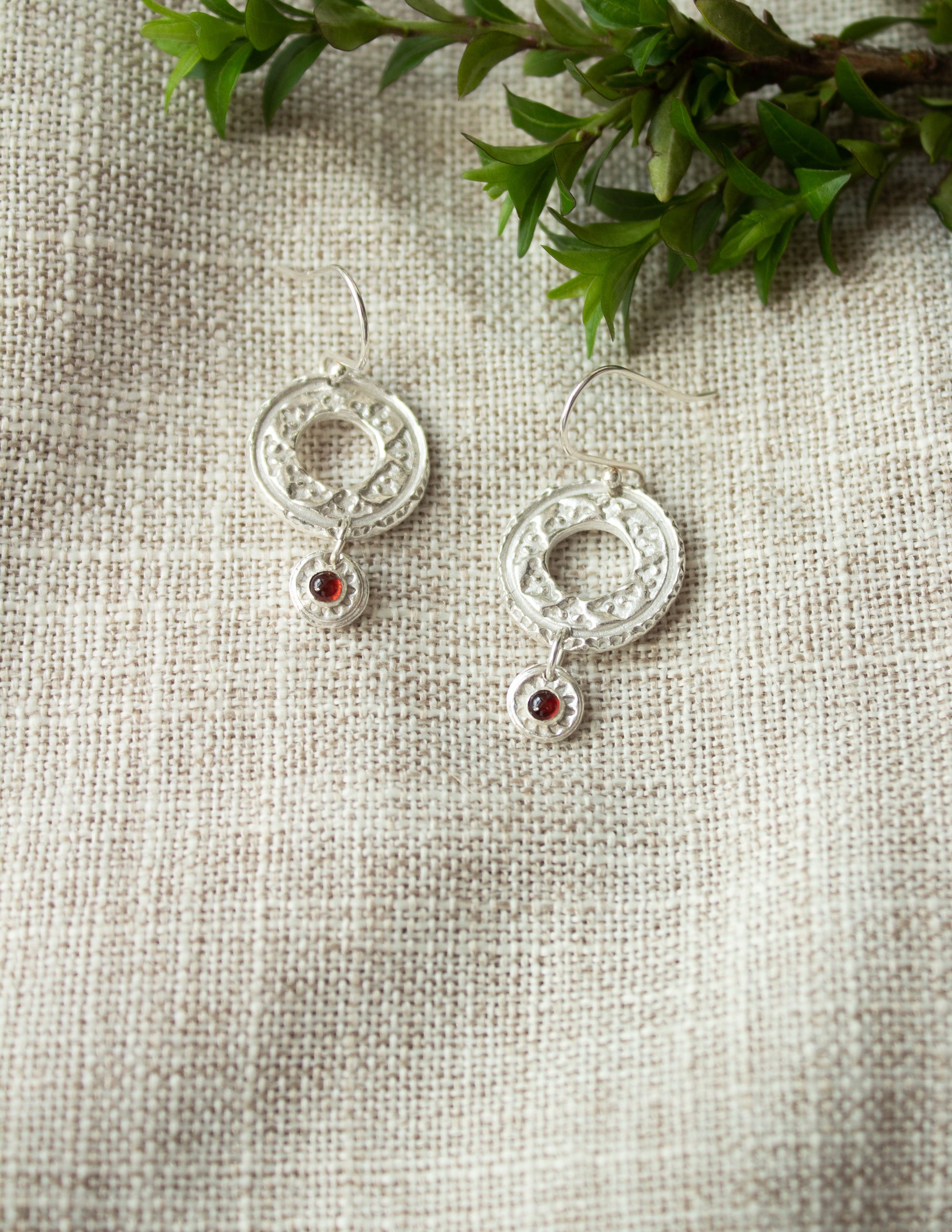 In photo Three the model is wearing the earrings set with the Amber stones which has orange warm hues. Other photos are shown with Garnet which is red and Moonstone which is white/clear with rainbow flashes.