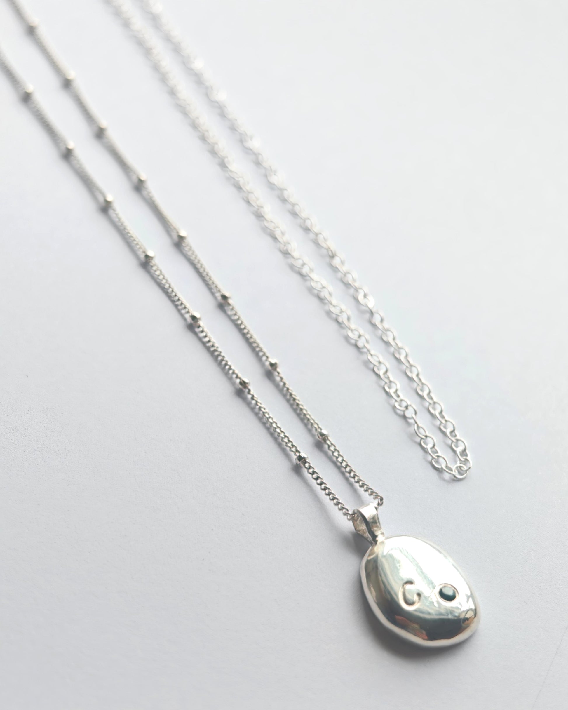 Are you in search of a personalised addition to your jewellery collection? Look no further than our exquisite recycled silver organic necklace. You have the option to keep it plain or enhance it with an initial or a small gemstone for that extra sparkle.