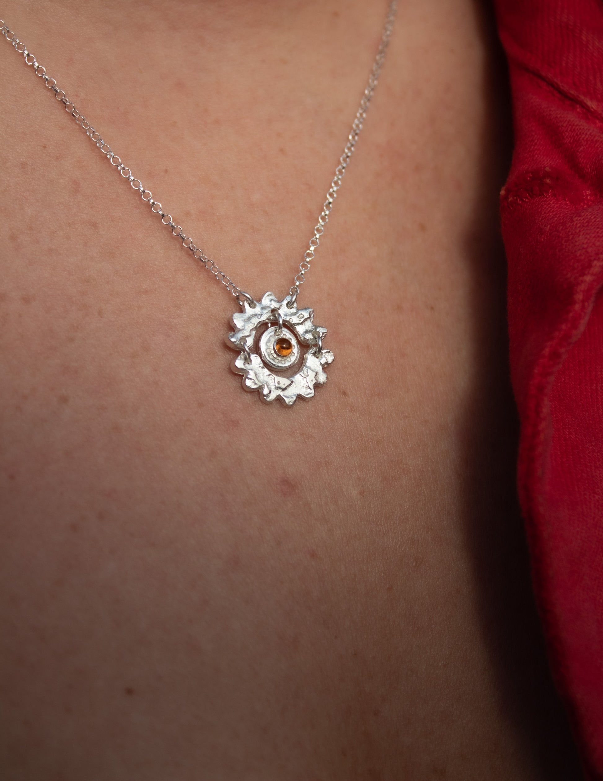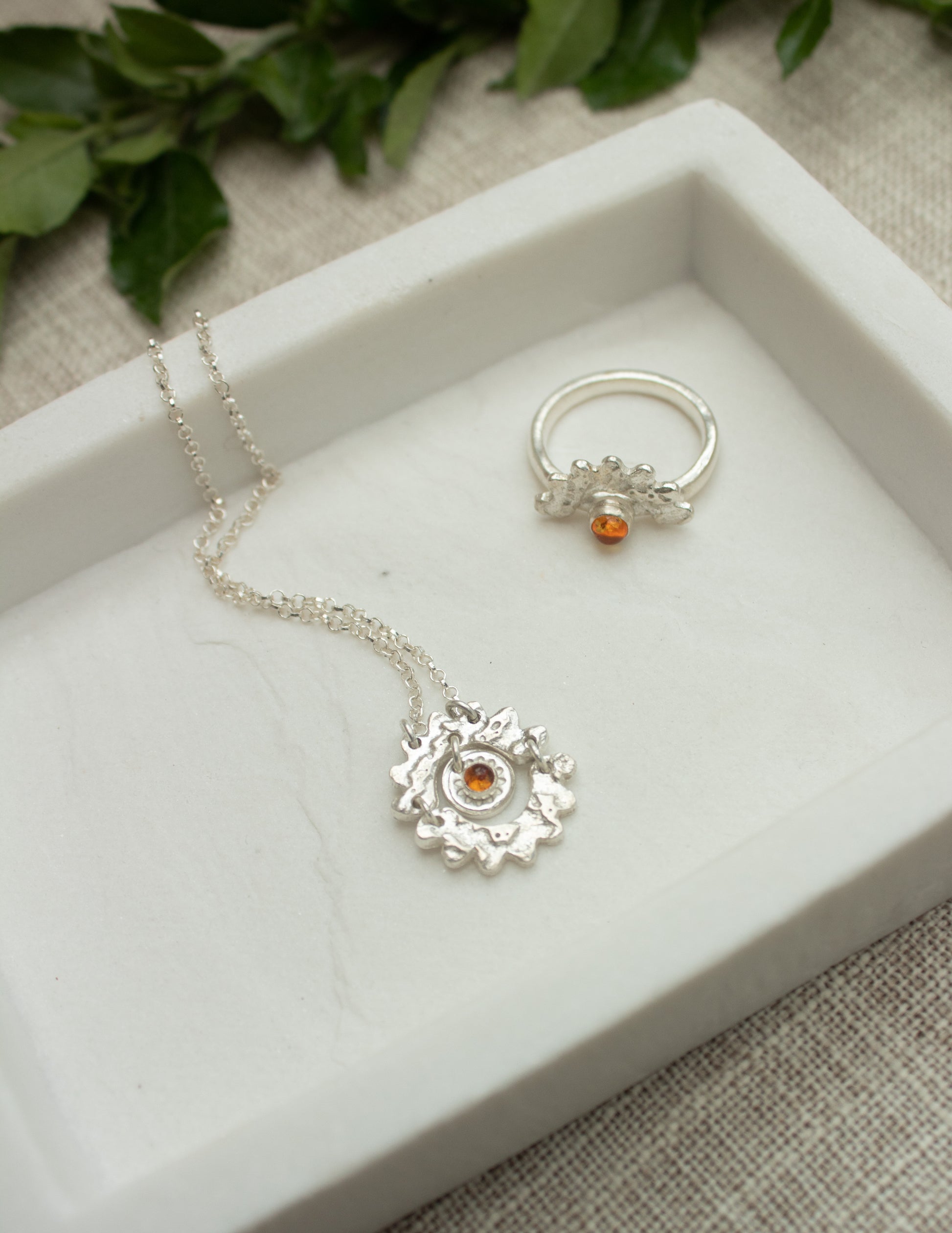 This new Saint Lucia Amber pendant necklace is beaming with beautiful sunshine’s and positivity. With the organic sunshine raise cradling the centre Amber stone in the centre it radiates joy and happiness.